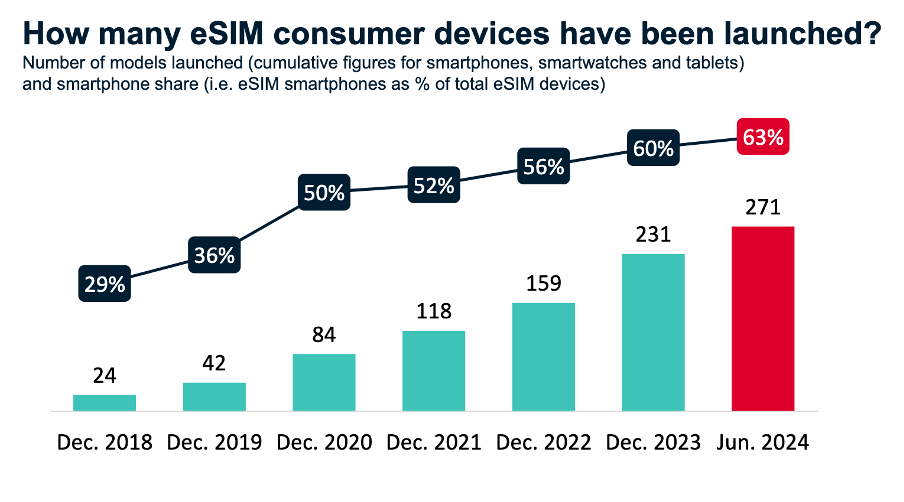 - In 2024, eSIM device shipments exceeded half a billion units, growing 35% year-on-year to reach 503 million. TCA