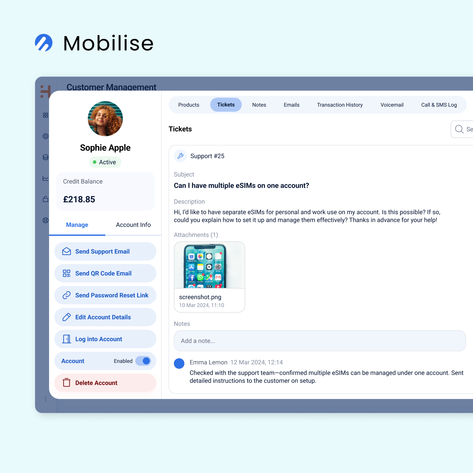 - Real-time insights into activation status, plan history, and customer interactions.