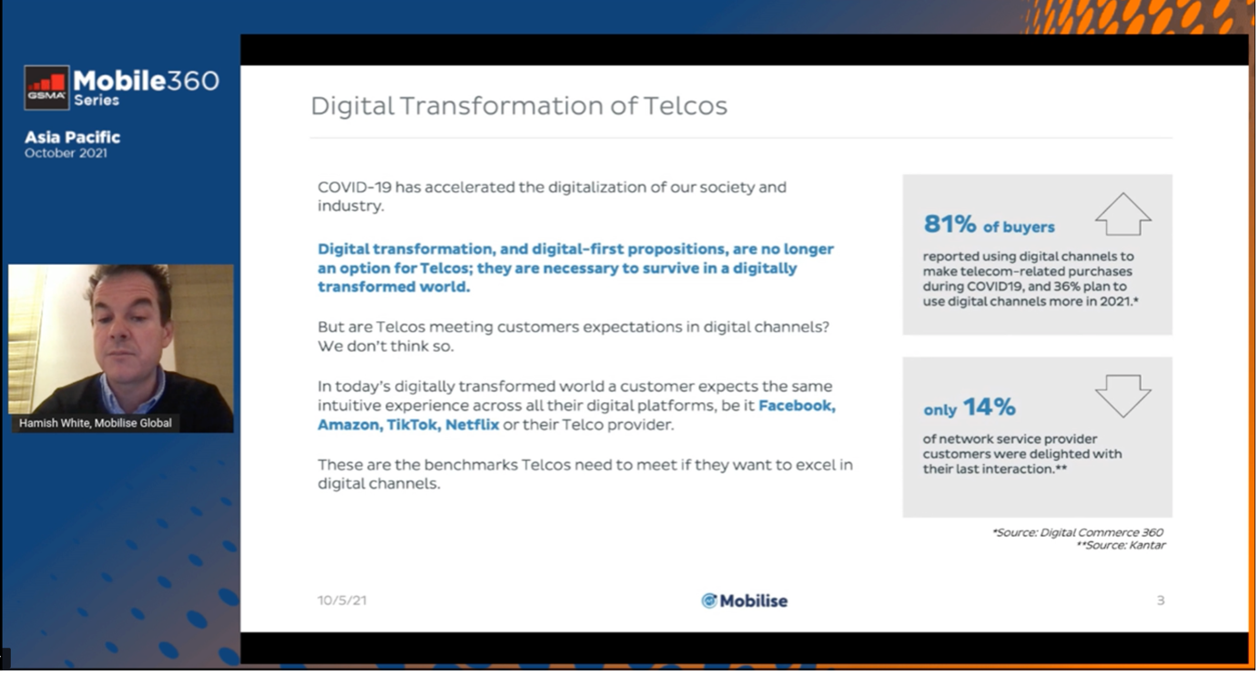 To claim their stake in an increasingly competitive market, telcos need to go digital. In his session at the GSMA’s event, which was held on October 5th, Mobilise’s CEO Hamish White addressed some of the challenges telcos face when embarking on a digital transformation, and how such hurdles can be overcome.